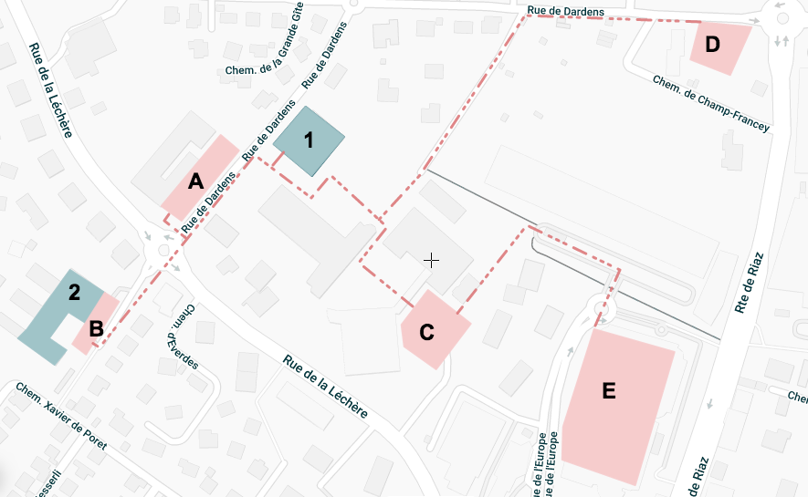 2 = Halle de gym de La Léchère (Chemin de l’Abbé-Maignon – Bulle)